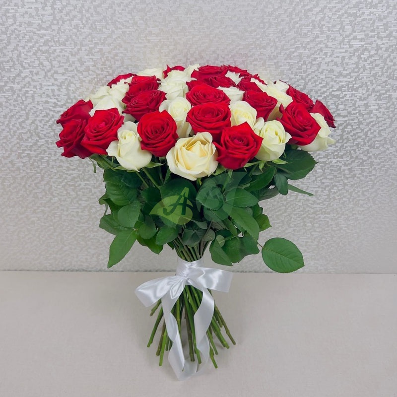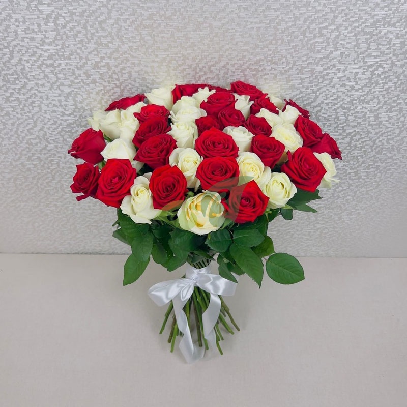 Состав и характеристики букета 51 красная и белая роза "Россия":