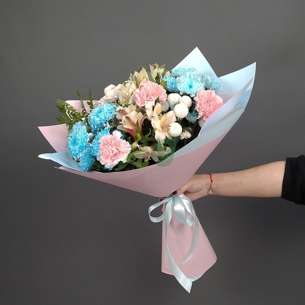 Сочетание голубого, белого и розового цветов замечательно подойдет для подарка как девушке, так и мужчине. Такой букет можно подарить и на выписку из роддома, и на свадьбу молодым.